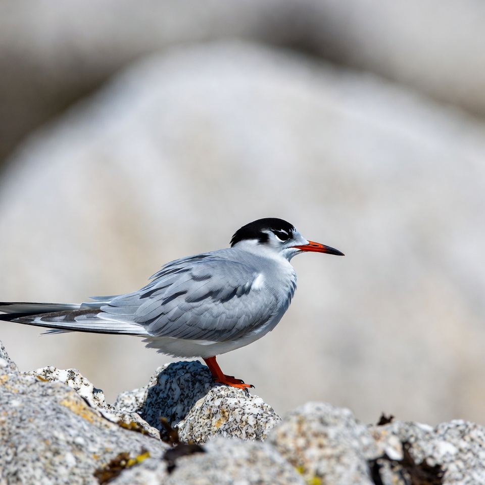 avian, bird, black cap, feathers, gray bird, natural habitat, nature, orange bill, orange legs, perched, rock, rocks, sea bird, shorebird, standing, tail feathers, tern, wildlife, gull-billed tern