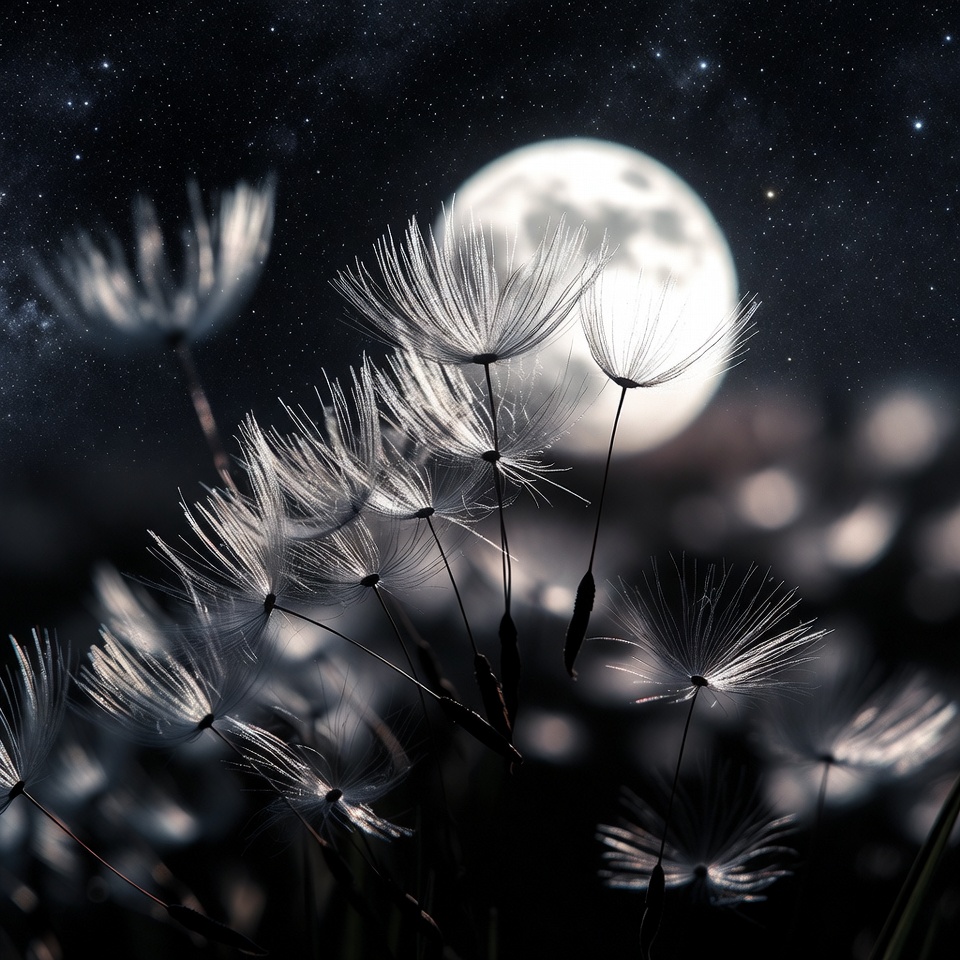Several white dandelion seed heads glow softly against a starry night sky. A large full moon shines brightly behind the delicate stems and fluffy seeds. The scene features a dark bokeh background with subtle sparkles.