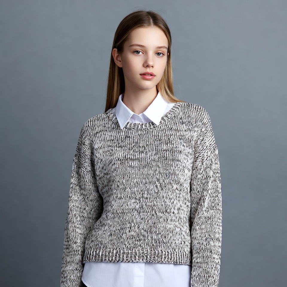 White, blonde hair, chunky sweater, collared shirt, fashion, female, gray sweater, isolated background, knit sweater, light eyes, long hair, model pose, straight hair, studio portrait, white shirt, young woman, woman