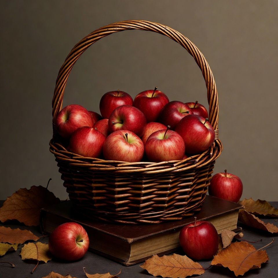 A wooden basket filled with fresh red apples sits on an old leather-bound book. Scattered autumn leaves surround the base of the basket and book on a neutral background. The apples are shiny and vibrant, with some spilling slightly over the edges.