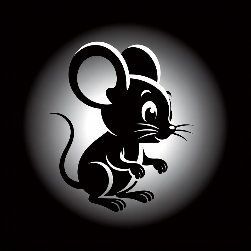 A cute cartoon mouse in black silhouette stands on all fours with large round ears, big expressive eyes, whiskers, and a curly tail. The illustration features bold white outlines against a glowing circular gray background. It has a playful and friendly appearance with paws visible.
