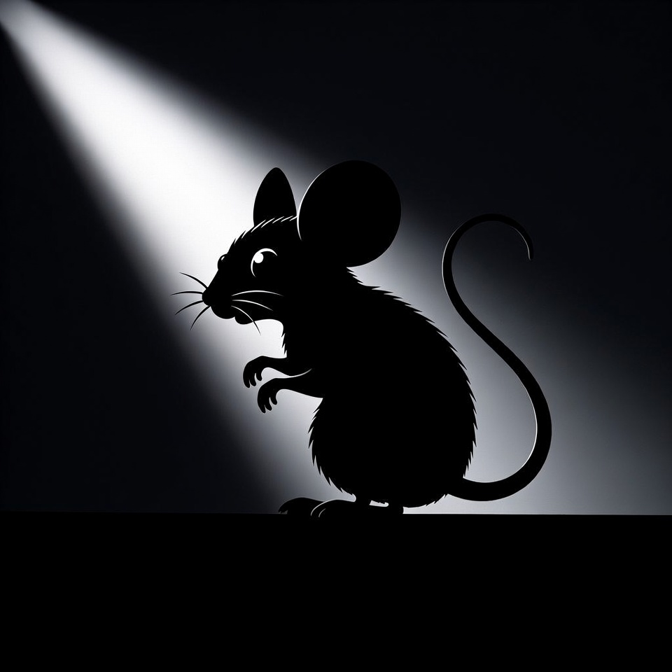 A black silhouette illustration of a cute mouse stands on its hind legs under a bright spotlight. The mouse has large ears, whiskers, and a long tail, posed against a dark background. The image features a simple vector style with dramatic lighting.