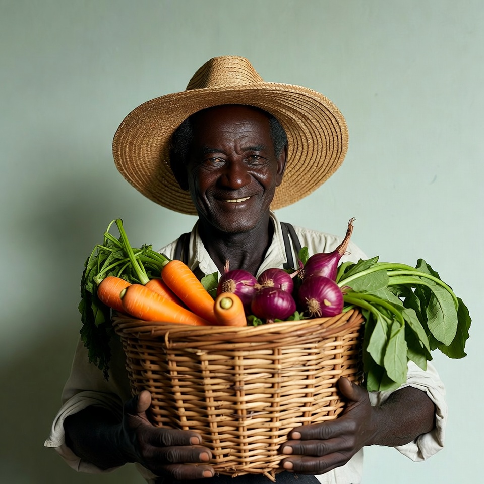 An elderly African man with a wide smile holds a woven basket overflowing with fresh carrots, beets, and greens. He wears a wide-brimmed straw hat and a light-colored shirt with overall straps. The image is set against a plain light green background.