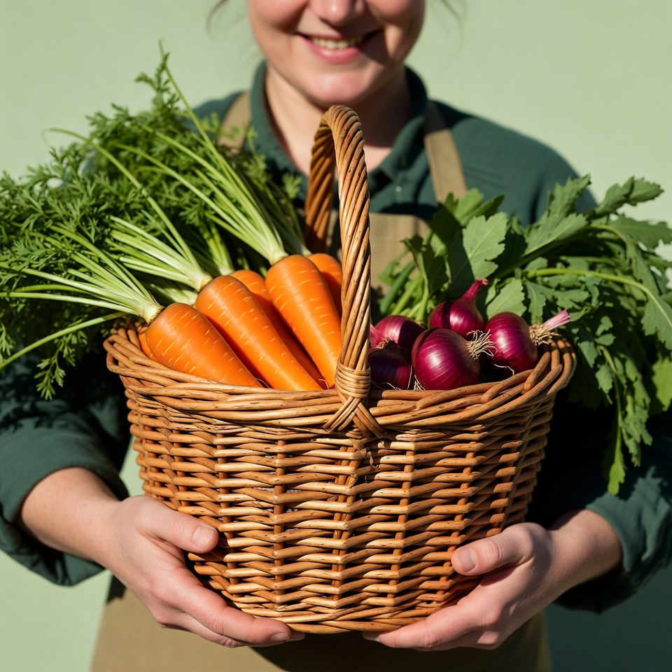 A smiling White woman in a green apron holds a woven basket overflowing with fresh carrots, beets, and greens. She stands against a light green background, presenting the colorful harvest directly toward the viewer. The vegetables include orange carrots with green tops, red beets, and leafy greens.