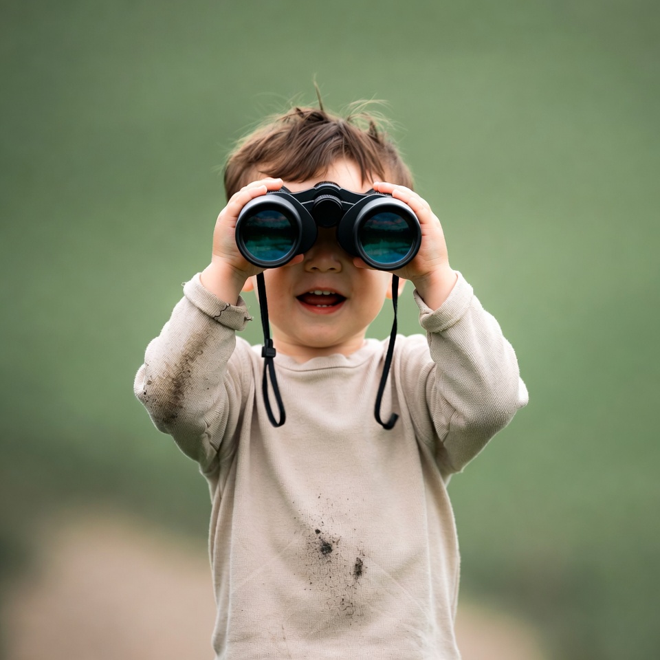 A young boy with tousled brown hair holds black binoculars up to his eyes while standing outside. He wears a beige long-sleeved shirt with dirt smudges on the sleeves and smiles happily. The background features a blurred green grassy area.