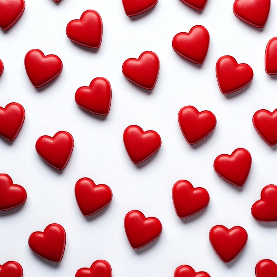 Red hearts scattered on white background