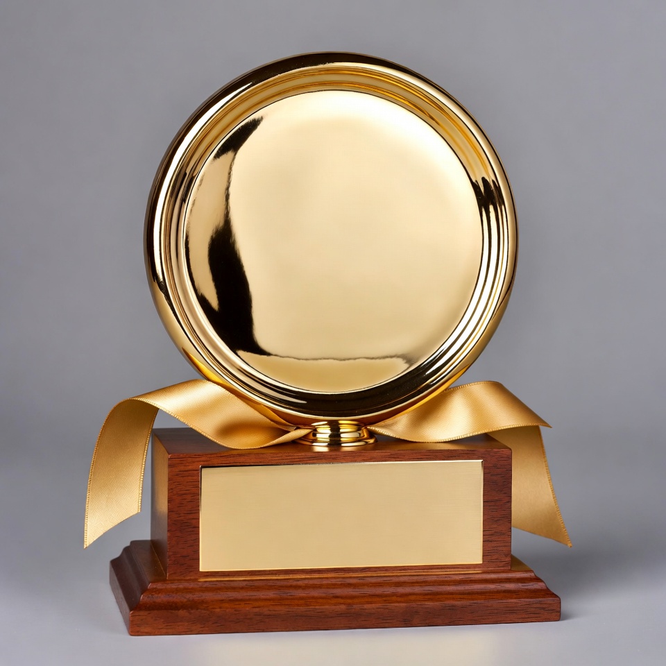 Gold Trophy with Ribbon on Wooden Base
