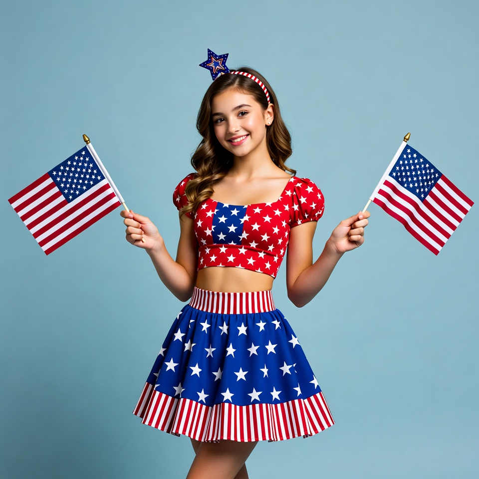 A smiling young girl with wavy brown hair and a star headband stands against a blue background. She wears a red, white, and blue American flag-themed crop top and skirt. She holds two small American flags in her hands.