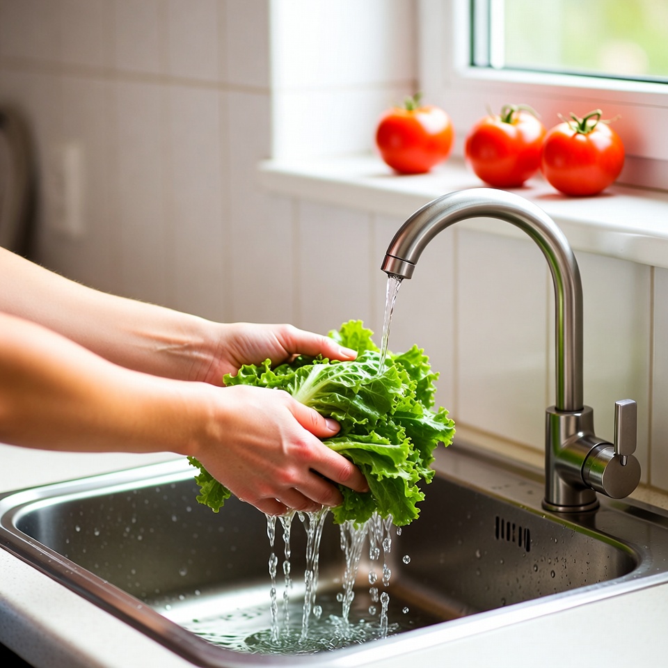 Woman Washing Lettuce Under Kitchen Faucet