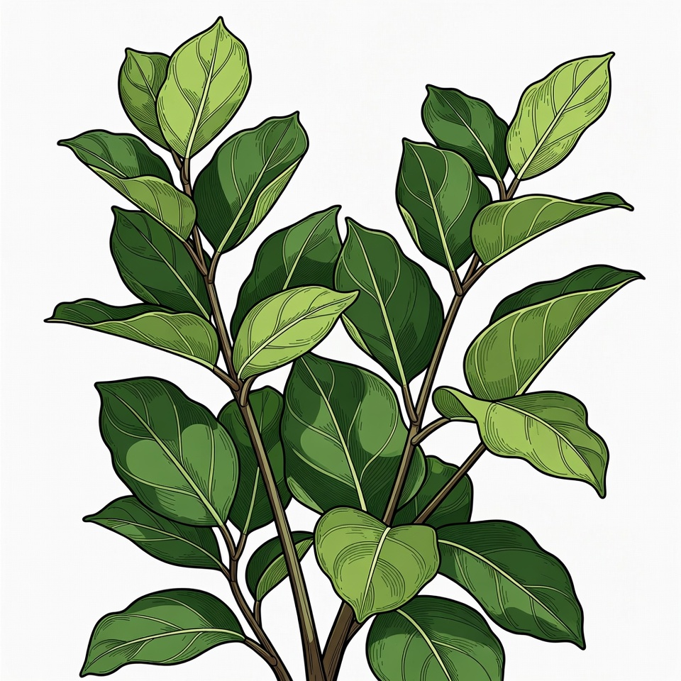 A detailed watercolor-style illustration of a lush green plant with multiple broad leaves. The leaves feature prominent veins and vary in shade from light to dark green. It is isolated on a white background.