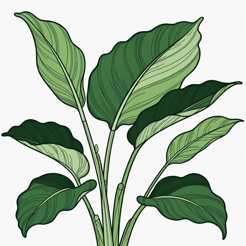 A detailed line art illustration of a peace lily plant features large, glossy green leaves with white veins on a plain white background. The leaves curve gracefully from long stems, showcasing varied shades of green. It is depicted in a simple, isolated style suitable for decorative use.