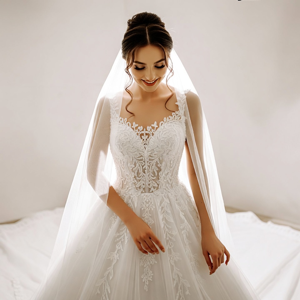 White, bridal gown, bridal portrait, dark hair, detailed lace, elegant bride, embroidered gown, female, flowing veil, happy bride, lace dress, luxury wedding, marriage attire, off-shoulder dress, sheer veil, smiling woman, studio photo, updo hairstyle, veil, wedding dress, wedding fashion, white background, white gown, woman smiling, bride