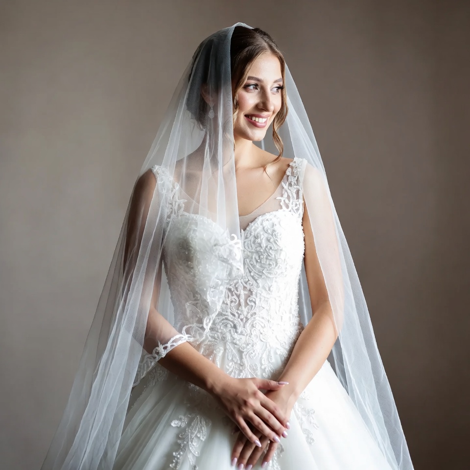 White, brunette hair, elegant bride, embroidery, female, hands clasped, lace gown, long veil, portrait, sleeveless dress, smiling woman, studio photo, updo, veil, wedding dress, wedding gown, bride