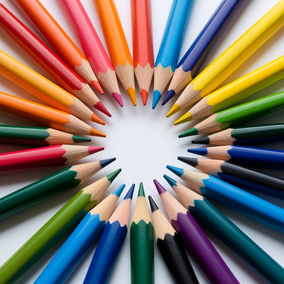 A vibrant collection of colored pencils is arranged in a perfect circle on a white background. The pencils radiate outward in a full spectrum of colors including red, orange, yellow, green, blue, purple, and black. Their sharpened tips point toward the center, creating a symmetrical and eye-catching pattern.