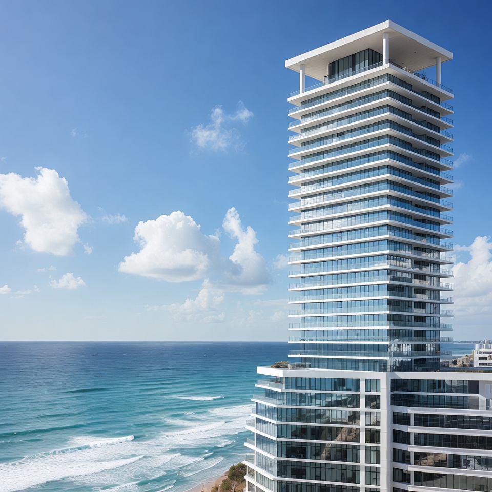 beachfront, blue sky, clouds, glass facade, high-rise, luxury tower, modern architecture, ocean view, sand, seaside, tall building, waterfront, waves, white building, skyscraper