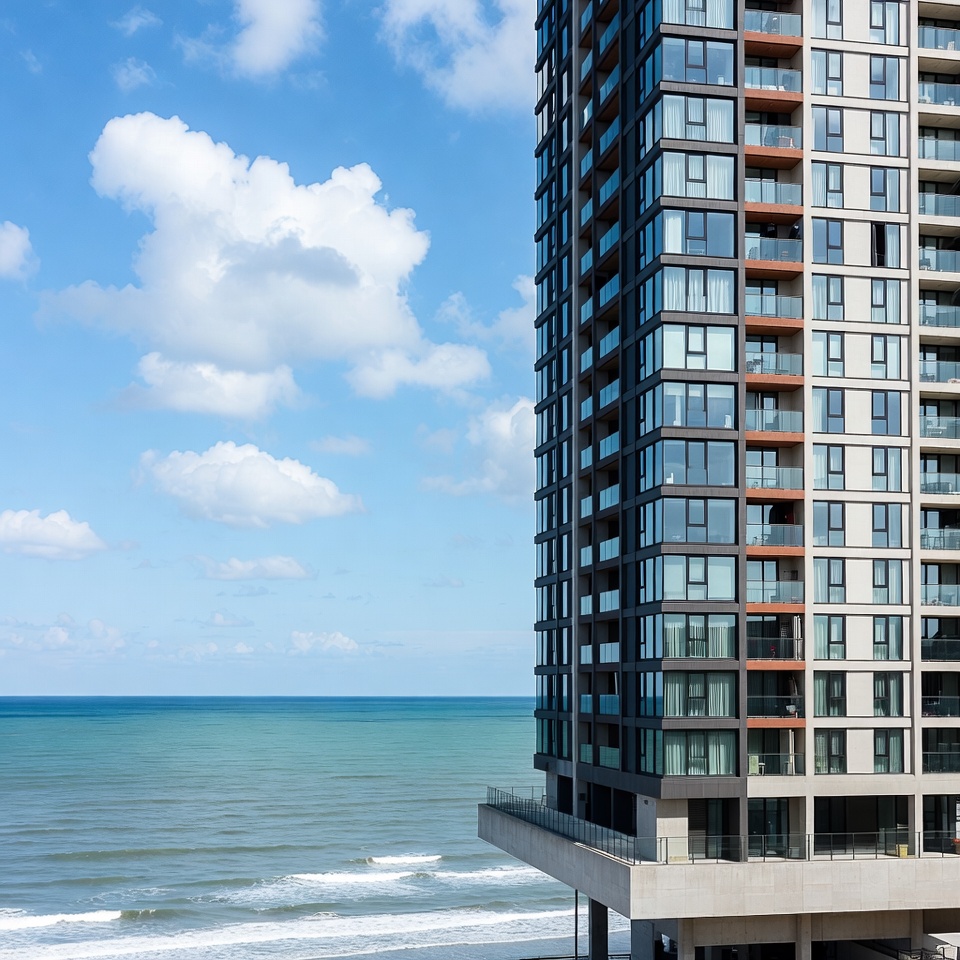 apartment building, balconies, beach, blue sky, coastal architecture, glass windows, luxury apartments, modern architecture, ocean view, sea, seaside tower, tall building, waterfront property, white clouds, high-rise building
