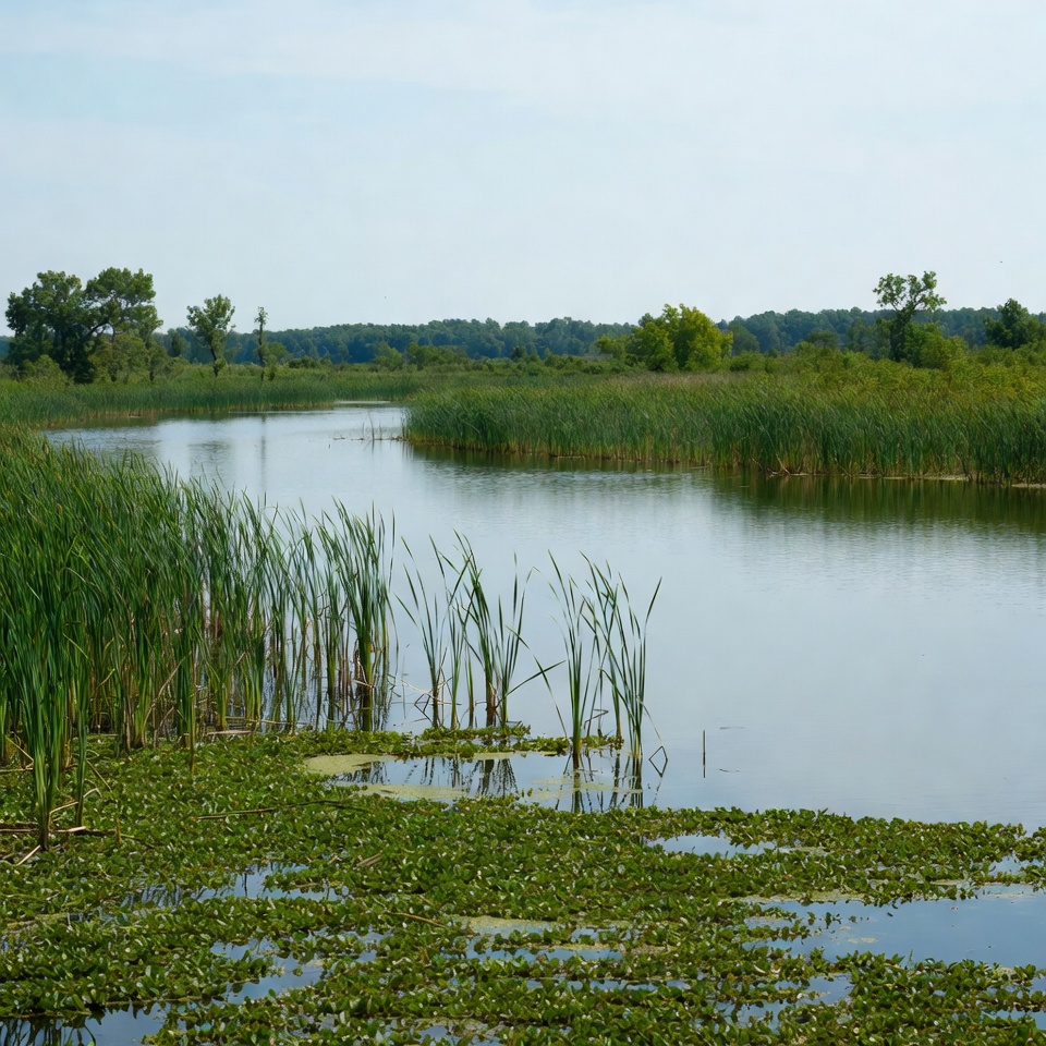 A calm river winds through a lush marshland surrounded by tall green cattails and reeds. Scattered trees line the distant horizon under a clear blue sky. Patches of green lily pads float on the water's surface.