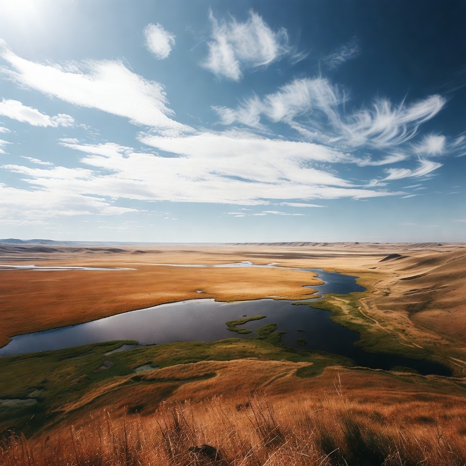 aerial view, autumn, blue sky, canyon, clouds, golden hills, grass, grassland, hills, horizon, lake, nature, outdoors, panoramic, reflection, river, scenery, steppe, sunny, terrain, valley, vegetation, water, wide angle, wilderness, landscape