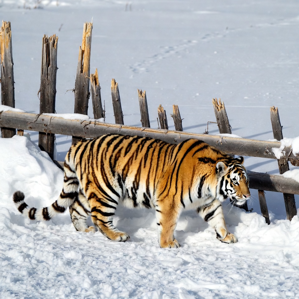 Siberian tiger, animal, black stripes, isolated background, orange fur, paw prints, snow, snowy field, walking tiger, wildlife, winter, wooden fence, tiger
