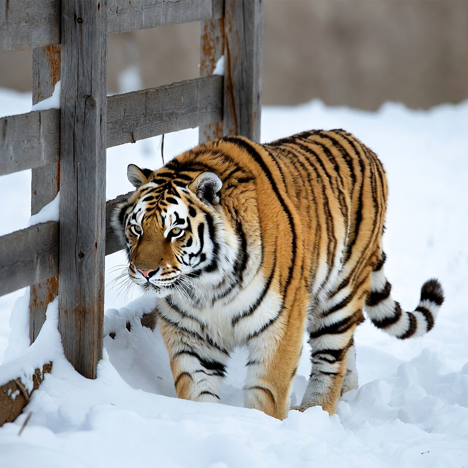 A tiger with orange fur and black stripes peers through a weathered wooden fence in a snowy landscape. Snow covers the ground around the fence, and the tiger's face is close to the bars, showing intense eyes and whiskers. Its body is partially visible behind the fence, with a fluffy tail extending into the snow.