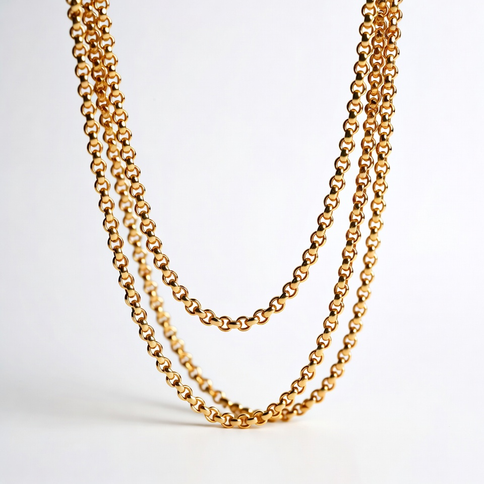chain links, chain necklace, fashion accessory, gold chain, gold links, isolated background, jewelry, layered necklace, luxury jewelry, metal jewelry, necklace, pendant necklace, shiny gold, triple strand, gold necklace