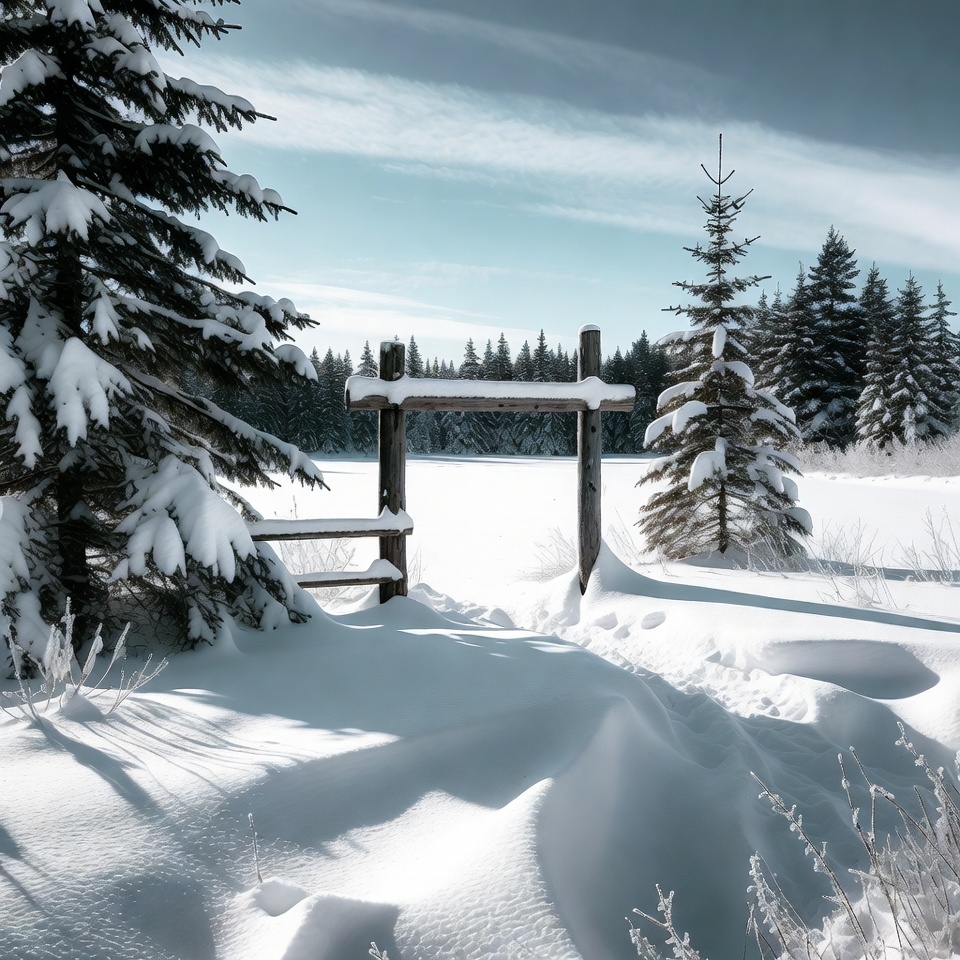 A rustic wooden gate covered in snow stands in a vast snowy field surrounded by evergreen pine trees. The gate has horizontal rails and posts dusted with fresh powder. A clear blue sky with wispy clouds frames the serene winter landscape.