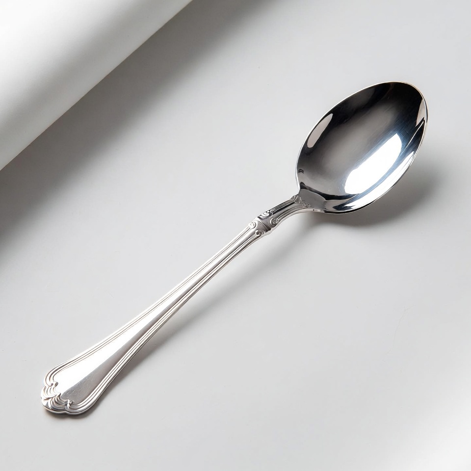 cutlery, dining, elegant, isolated background, kitchenware, metal, ornate handle, polished, serving spoon, shiny, spoon, stainless steel, tableware, utensil, silver spoon