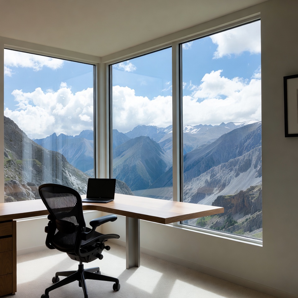 alpine view, blue sky, chair, clouds, corner windows, desk, ergonomic chair, framed picture, home office, interior design, laptop, modern office, mountain view, mountains, snowy peaks, sunlight, window, wooden desk, workspace, office