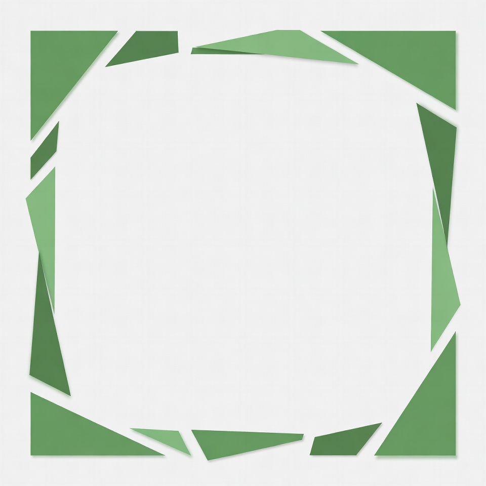 A green geometric frame made of overlapping triangular paper cutouts forms an irregular octagonal shape around a white center. The frame features various shades of green with sharp angles and layered segments. It is isolated on a white background.