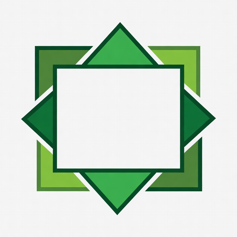A vector illustration of a green diamond-shaped frame with a white center square. The design features layered green triangles and rectangles forming a symmetrical border. It is isolated on a white background.