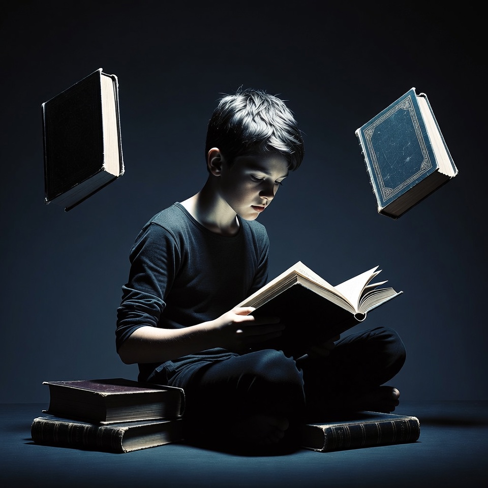 A young boy with short dark hair sits cross-legged on the floor, intently reading an open book in his lap. Several antique books float magically around him against a dark background. Stacks of books rest beneath him on the floor.