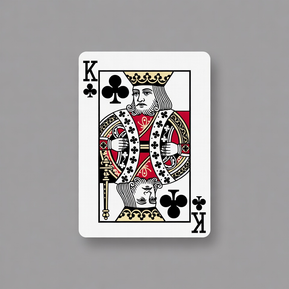 White, card game, clubs suit, crown, gold patterns, illustration, isolated background, king, male, playing card, poker card, red robe, scepter, white background, King of Clubs