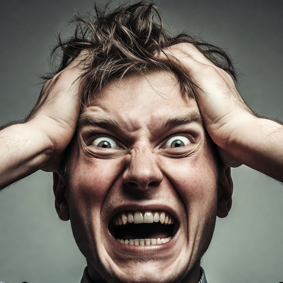 White, angry face, closeup, collared shirt, distress, dramatic lighting, emotional, fear, frustration, furrowed brows, hands on head, horror, intense gaze, isolated background, male, messy hair, open mouth, panic, portrait, pulling hair, screaming, shocked expression, teeth, wide eyes, man