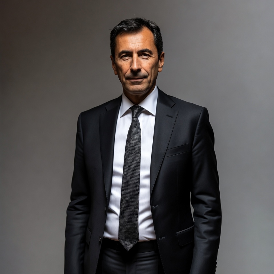A middle-aged man with short dark hair and a mustache stands confidently against a plain gray background. He wears a tailored black suit, white dress shirt, and black tie. His expression is serious with a slight smile.