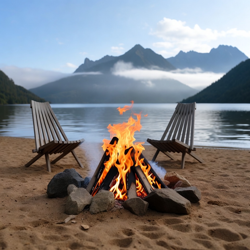 Campfire on Lakeside Beach with Chairs