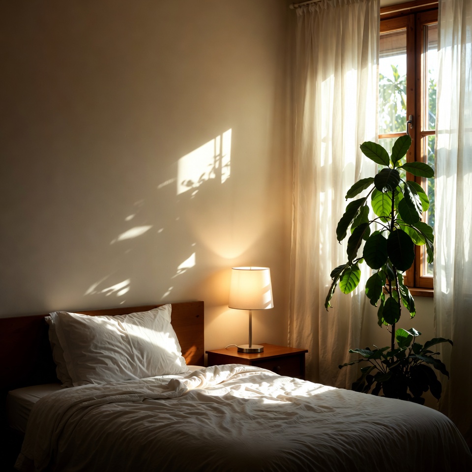 A cozy bedroom corner features a wooden bed with white rumpled sheets. Sunlight streams through sheer curtains on a large window, casting shadows across the beige walls. A potted green plant stands beside a bedside table with a lamp.