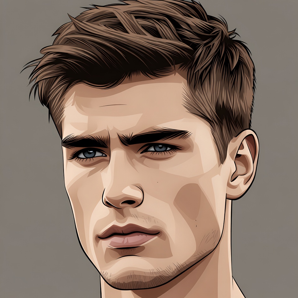 White, attractive man, blue eyes, brown hair, cheekbones, digital illustration, eyes, face, fair skin, gray background, handsome, illustration, lips, male, male portrait, portrait, short hair, tousled hair, vector art, young man, man