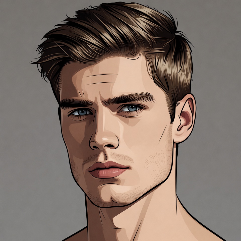 White, attractive man, blue eyes, brown hair, confident, digital art, fair skin, handsome, headshot, illustration, intense gaze, jawline, lips, male, male portrait, portrait, short hair, stylish hair, vector art, young man, man