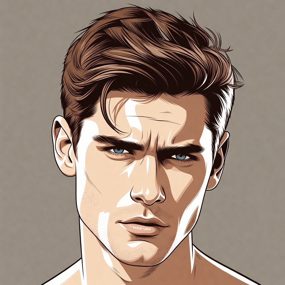 White, attractive man, blue eyes, brown hair, digital art, face, gray background, handsome, illustration, male, portrait, serious expression, short hair, vector art, wavy hair, young man, man