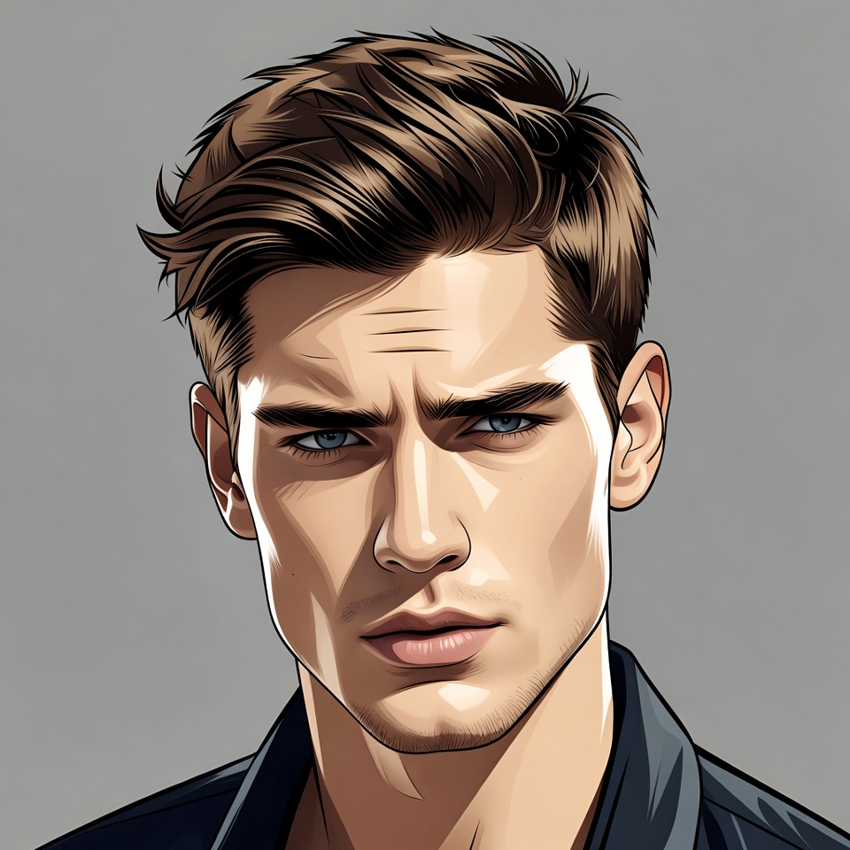 A digital illustration of a handsome young man with tousled brown hair and blue eyes stares directly at the viewer. He has a strong jawline, subtle stubble, and wears a dark collar visible at the neck. The portrait is set against a plain gray background.