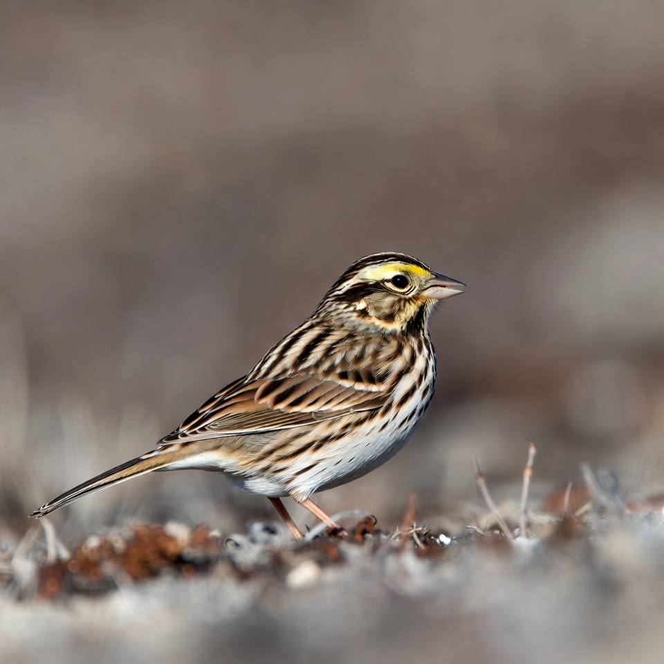 animal, bird, birds, brown bird, dry ground, finch-like, nature, outdoor, perching bird, rocks, songbird, sparrow, sparse grass, streaked feathers, wild bird, wildlife, yellow eye stripe, savannah sparrow