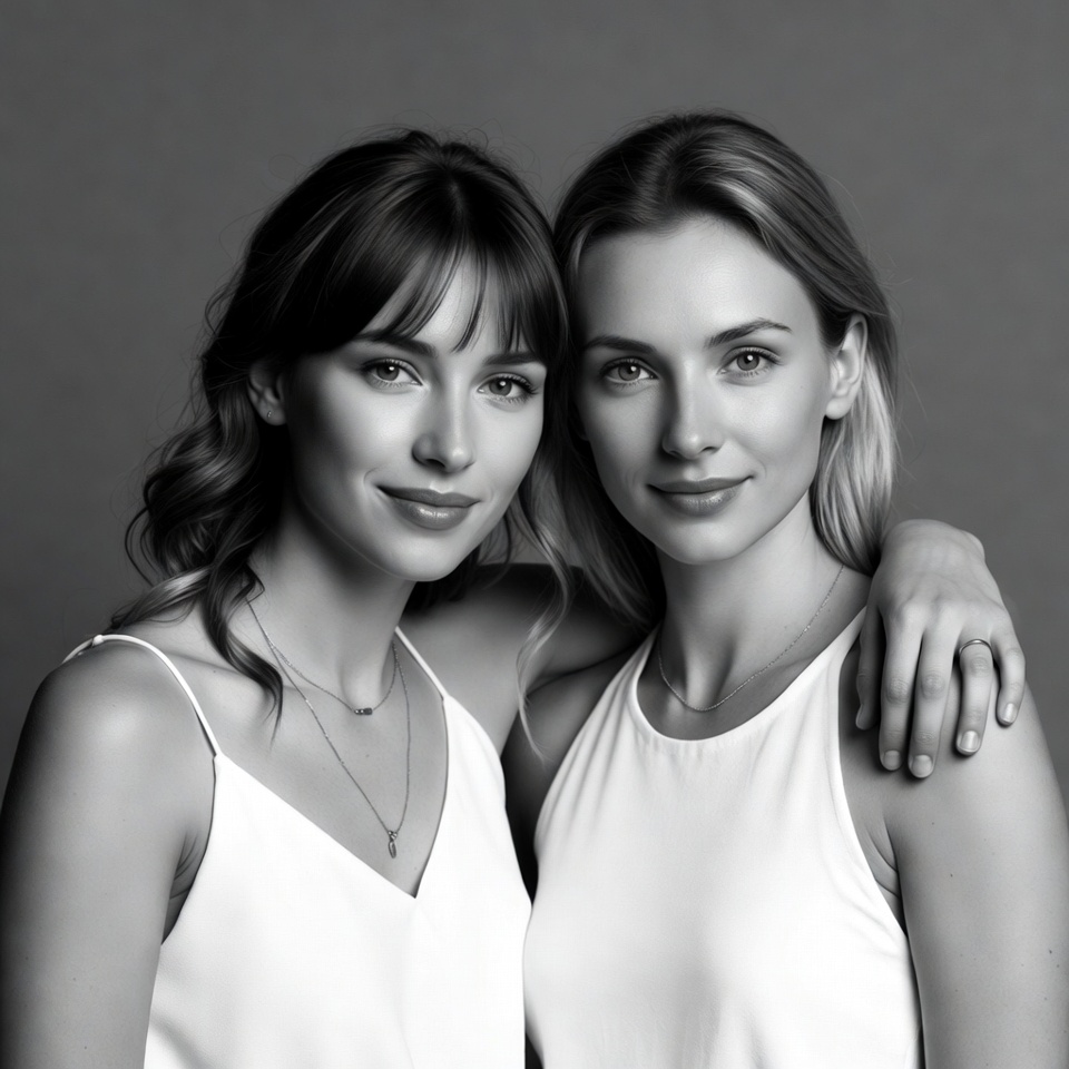 Two young women with light skin stand close together in a black and white portrait against a gray background. The woman on the left has wavy dark hair and wears a white spaghetti-strap top with a necklace, while the one on the right has straight blonde hair and a similar white top. They smile softly with arms around each other.