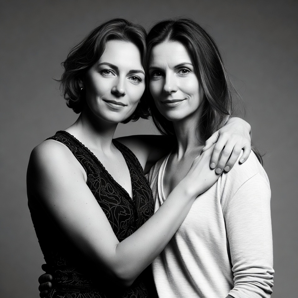 Two women with shoulder-length brown hair stand close together in a black and white portrait. The woman on the left wears a sleeveless black lace dress, while the one on the right is dressed in a light-colored top. They smile gently with arms around each other against a plain gray background.