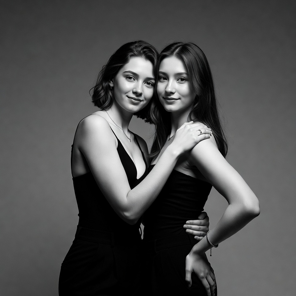 Two young women with shoulder-length dark hair stand closely together in a black and white portrait. The woman on the left has short bob hair and wears a sleeveless black dress with thin straps, while the one on the right has longer hair and a similar dress. They smile softly, with arms around each other against a plain gray background.