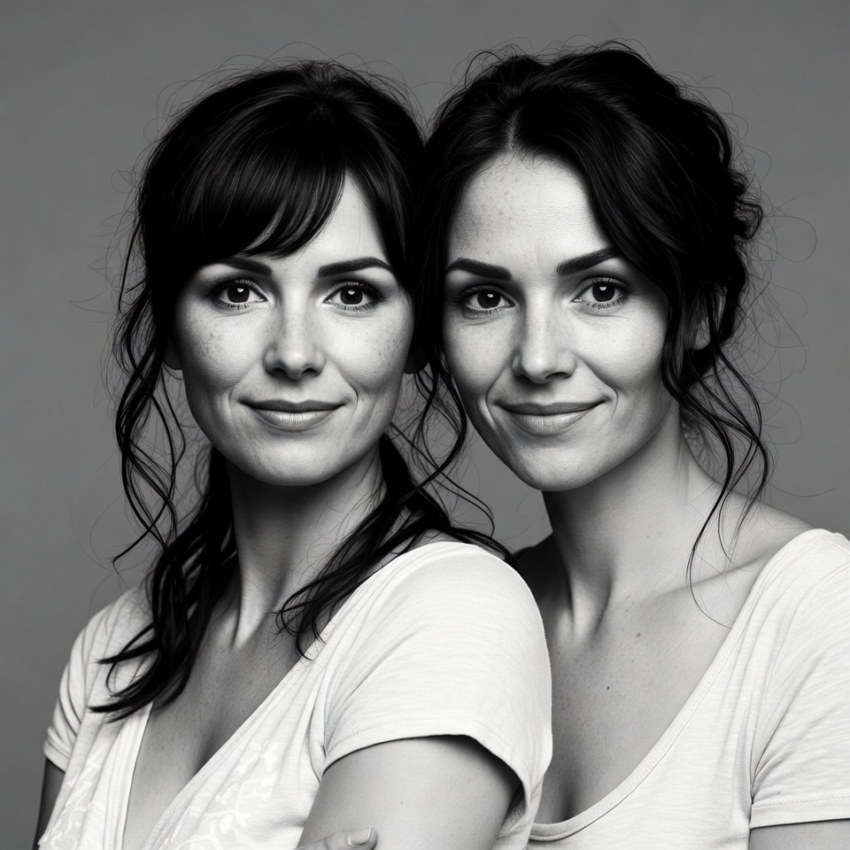 black and white, cheekbones, close-up, dark hair, eyes, faces, female, friends, headshot, portrait, sisters, smiling, studio photo, two women, updo hairstyle, white t-shirt, young women, women