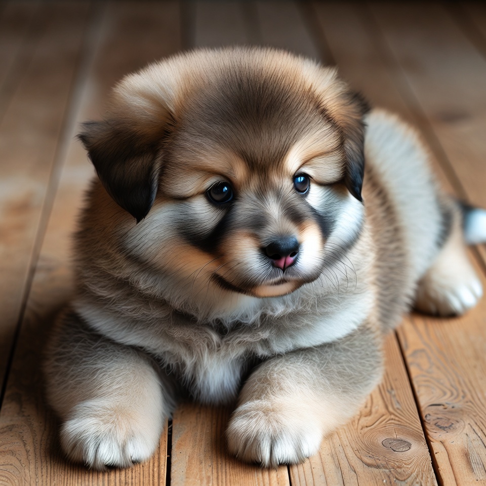 A small fluffy puppy with light brown and cream fur lies on a wooden floor. The puppy has big blue eyes and a slightly open mouth, looking directly at the camera. Its paws are extended forward in a playful pose.