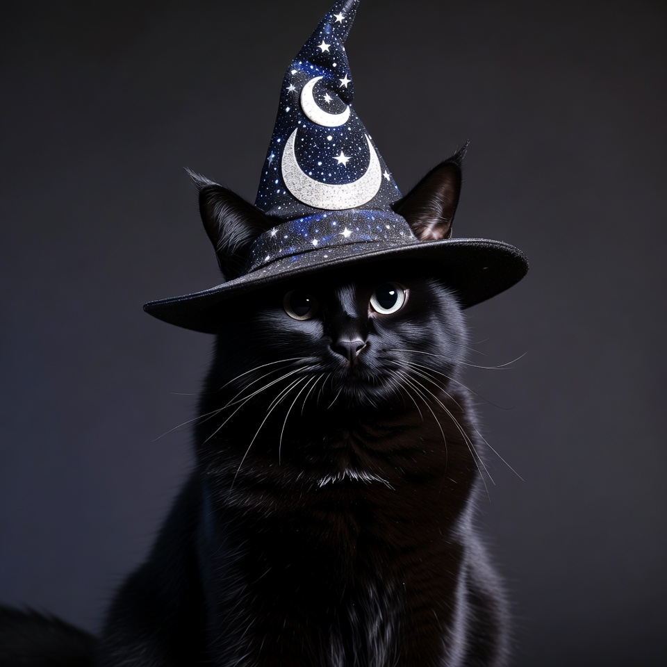 A black cat with green eyes wears a pointed witch hat adorned with stars and a crescent moon. The hat features a starry night sky design and sits atop the cat's head against a dark background. The cat gazes directly forward with a serious expression.