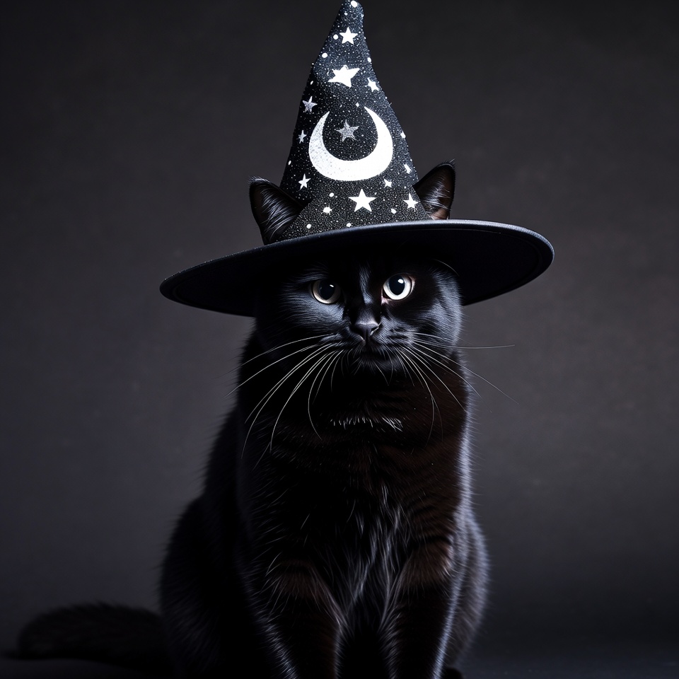 A black cat sits with a tall pointed witch hat adorned with white stars and a crescent moon on its head. The cat has bright green eyes and stares directly at the viewer against a dark background. Its fur is sleek and glossy, emphasizing the Halloween theme.