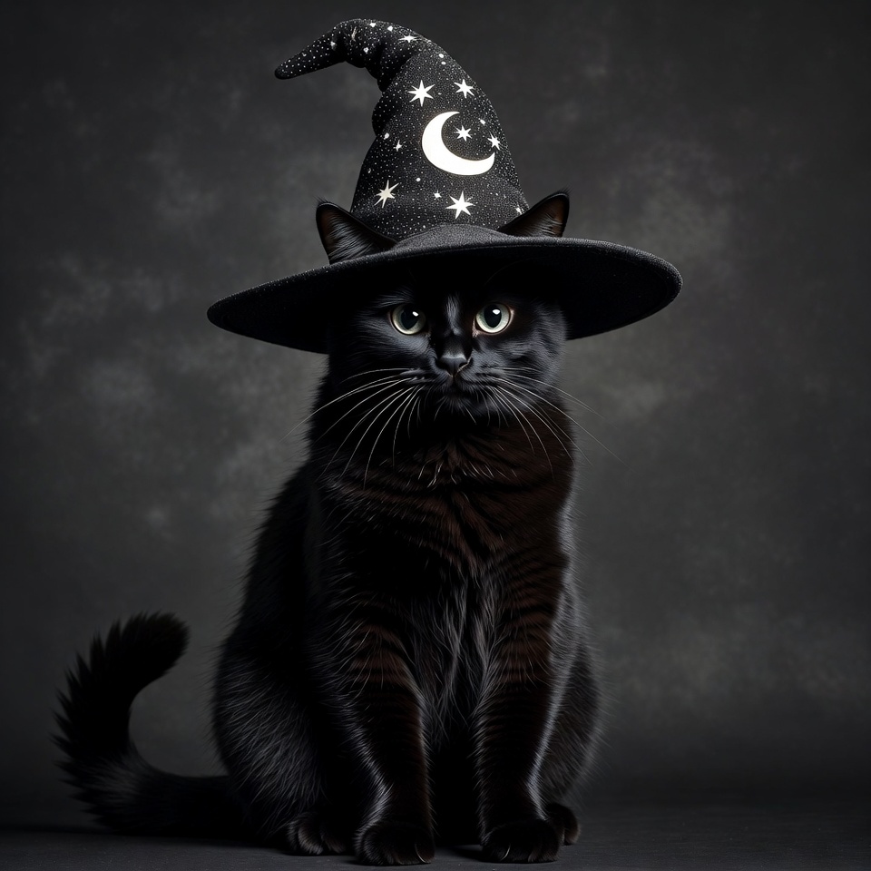 A black cat sits with a wide-brimmed black witch hat adorned with white stars and crescent moons on its head. The cat has green eyes and a serious expression, posed against a dark gradient background. Its fluffy fur and tail are visible in the Halloween-themed portrait.