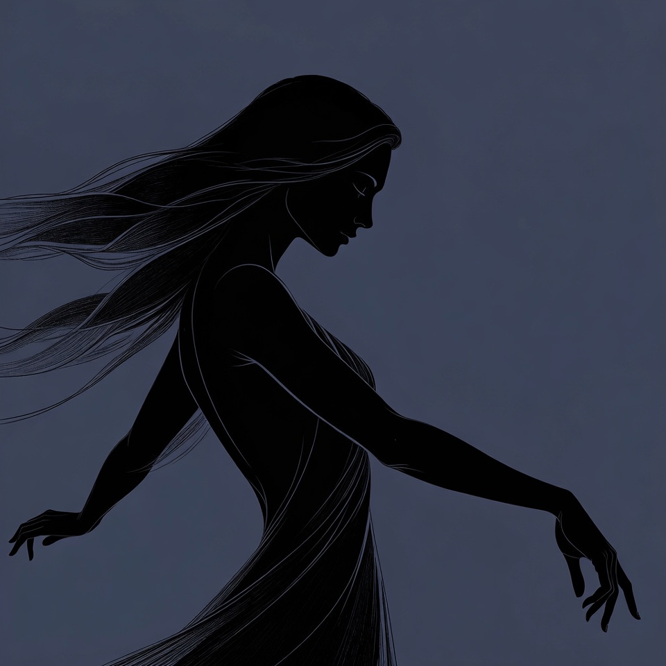 A black silhouette illustration of a woman in profile against a dark blue background. She has long flowing hair and is posed gracefully with one arm extended as if dancing. Her elegant figure is captured in a flowing dress.